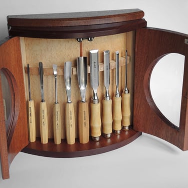 The cabinet is made of Sapele, an African tropical hardwood. It is highly valued for making objects of art and fine furniture. The interior is Bird's Eye Maple behind which are concealed magnets to keep the chisels in place. The windows are 1/2 mm plexiglass and the doors have knife hinges. The door handles are Sapele with inlaid Abalone Shell. (w=14", h=14")