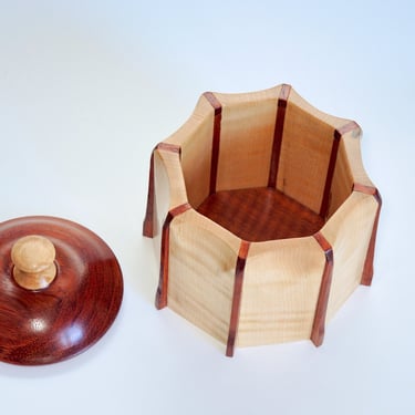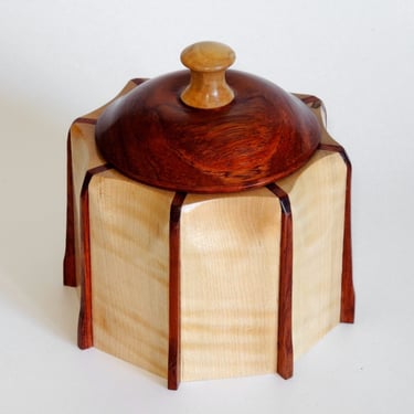The Cookie Jar is made of Caribbean Rosewood and Tiger Maple. Caribbean Rosewood is often used for fine furniture and decorative woodwork. Tiger Maple is often found in Michigan and other northern states. The grain offers a perfect contrast with the rosewood. (w=5", h=5")