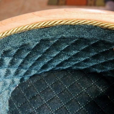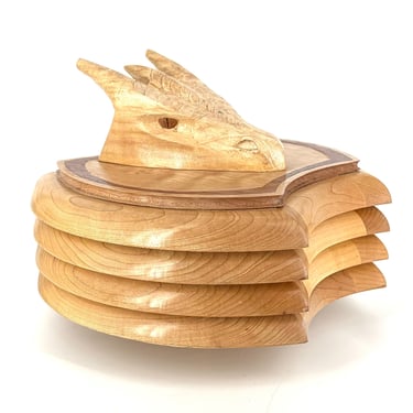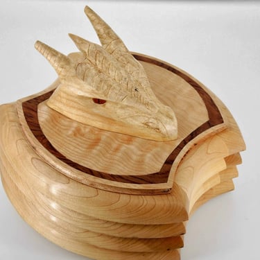 The dragon's head was carved from spalted maple and sits on a field of curly maple. Its eyes are mesquite wood with ebony pupils. The inlaid border is bubinga. The maple sides represent the dragon's scales. Interior is lined with emerald quilted velvet and the border piping is golden rope.